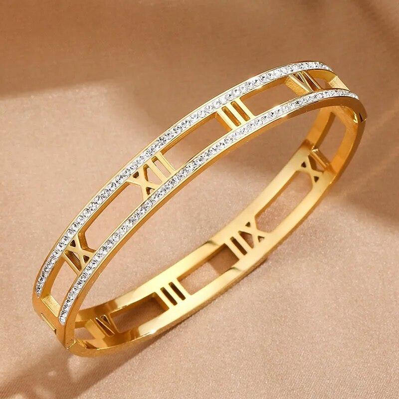 O Bracelete Numerais Romanos é uma peça de joalheria que combina estilo clássico e elegância moderna. Este bracelete é projetado com detalhes meticulosos, apresentando os numerais romanos de I a XII gravados em intervalos regulares ao redor do bracelete e zircônias cravejadas.